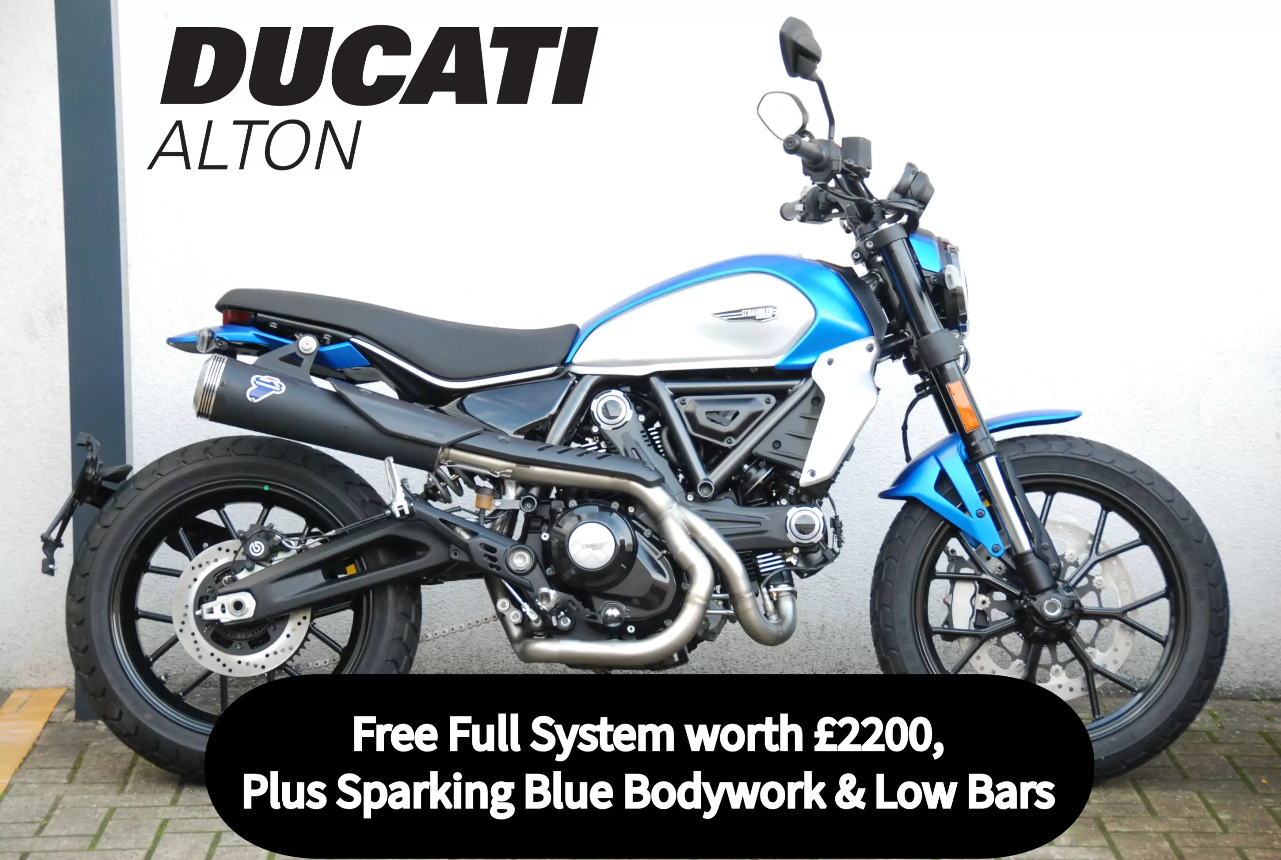 A brand new, unregistered 2025 Scrambler Icon with free Termignoni high level exhaust (worth £2200), Sparking Blue bodywork and low bars. One bike only for £10,395.