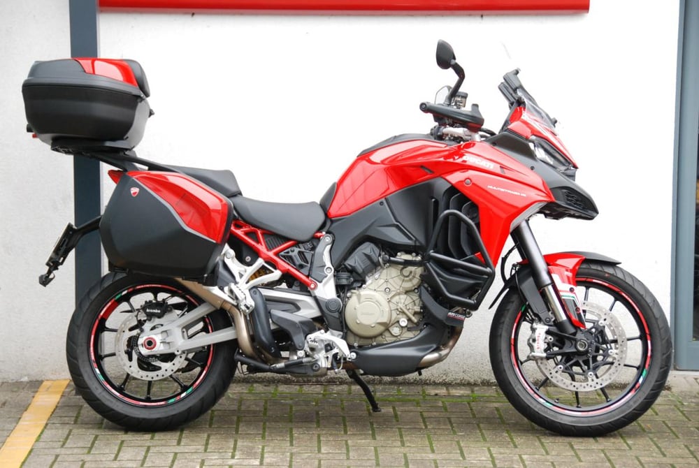 Multistrada V4S Radar supplied and serviced by ourselves with massive spec. Fitted with the official Touring Pack (panniers, heated grip and centre stand) plus the official Ducati top box, Akrapovic full exhaust system, balck engine bars, red sport side panels, Evotech radiator guards and Ducati low suspension kit (replacement fork springs, shock spring and shorter side stand). We also have the original parts to go with the bike if you wanted to return the bike back to the original height. The bike is also covered under factory warranty until the end of June 2027 and was serviced by us in July this year. Now on display in our Alton showroom.